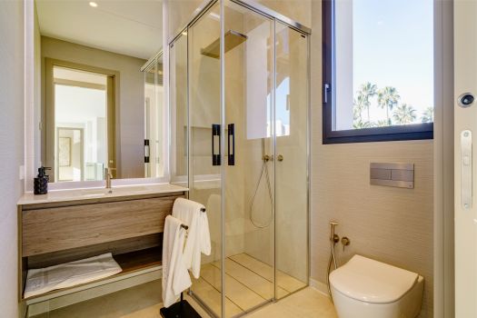 • Eerste verdieping met zeezicht: Twee fantastische slaapkamers met eigen badkamers en privéterrassen. De Master Bedroom suite heeft een kleedkamer en een complete badkamer met ligbad en inloopdouche.