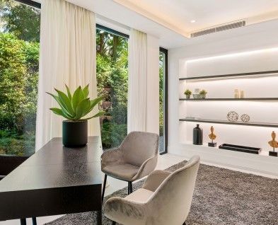 Het huis heeft een goed uitgerust kantoor, een ruime en gezellige keuken, en een grote woon-eetkamer met directe toegang tot het terras op de begane grond. De grote ramen laten je genieten van het betoverende uitzicht over de tuin en het zwembad.